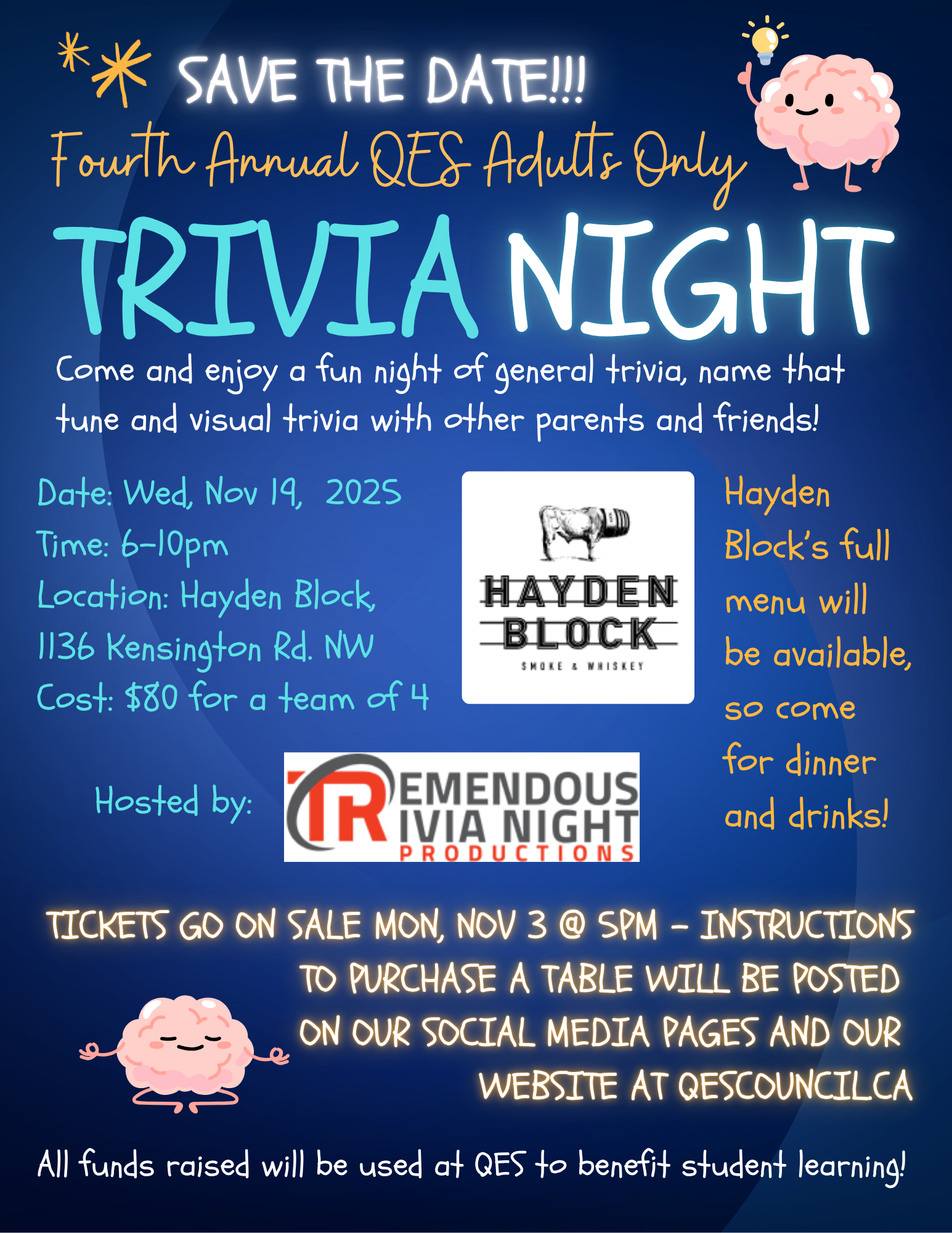 Enjoy great food, friendly competition, and a fun night out with other QES parents, all while giving back to our school community.
